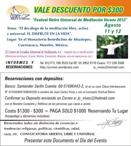 “FESTIVAL RETIRO UNIVERSAL DE MEDITACIÓN.VERANO 2012.AGOSTO 11 y 12. EN EL MONASTERIO BENEDICTINO DE AHUATEPEC,MORELOS.Tema “EL DISFRUTE EN LA VIDA.”Información completa en: http://wp.me/P17S2X-yi