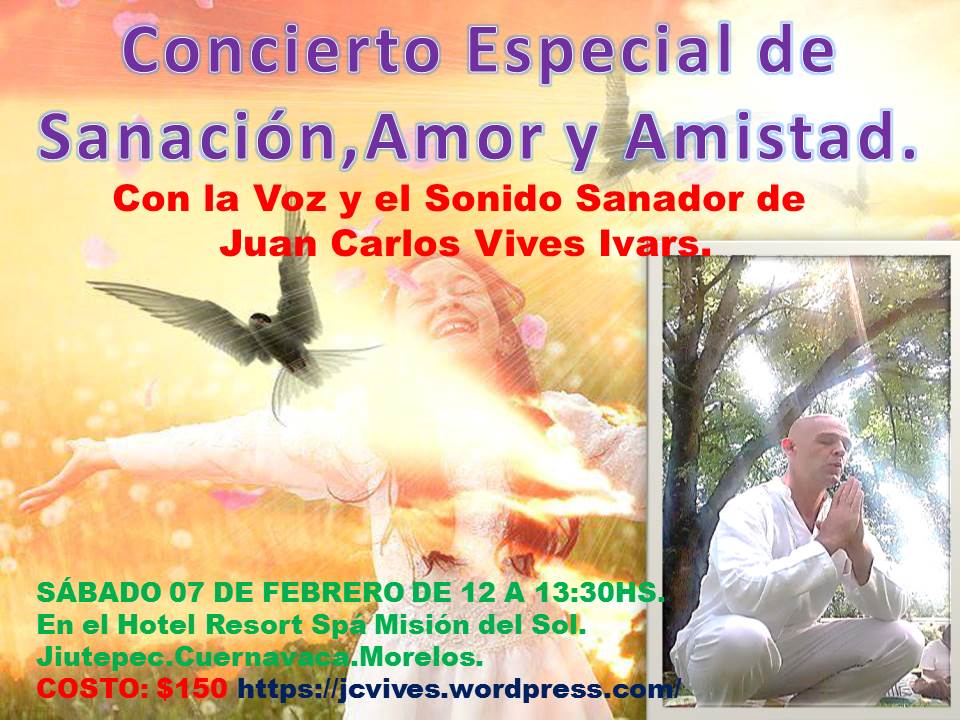 Juan Carlos Vives ha desarrollado el DON de la Sanación a través de su Voz Hablada y Cantada. Desde la Meditación Profunda en la que se Conecta con el Sonido Sanador, los poderes Espirituales de la Música y el Sonido, te llevan a una experiencia de conexión en la que el ESPÍRITU DIVINO UNIVERSAL se nos revela a cada uno y se dan experiencias de sanación y transformación sin precedentes. La Energía, la Luz y el Sonido son la Herramienta que el Sanador de Sanadores, el Creador, ha usado y seguirá usando para regalarnos Dones en Abundancia y Sanación. Los que estemos ahí para recibir y compartir estos Conciertos Trascendentes de Sanación y Meditación, realmente seremos sanados y transformados. (https://jcvives.wordpress.com/curriculum-de-juan-carlos-vives-ivars/)