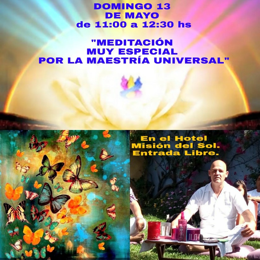 !!!! Y AMIGOS DE LA MEDITACIÓN!!!! Este domingo 13 de Mayo de 11:00 a 12:30 hs. "MEDITACIÓN MUY ESPECIAL POR LA MAESTRÍA UNIVERSAL" en El Hotel Misión del Sol. Jiutepec. Morelos.ENTRADA LIBRE. Se sugiere donativo Voluntario. DIFÚNDELO Y TE ESPERAMOS UNIVERSALMENTE.