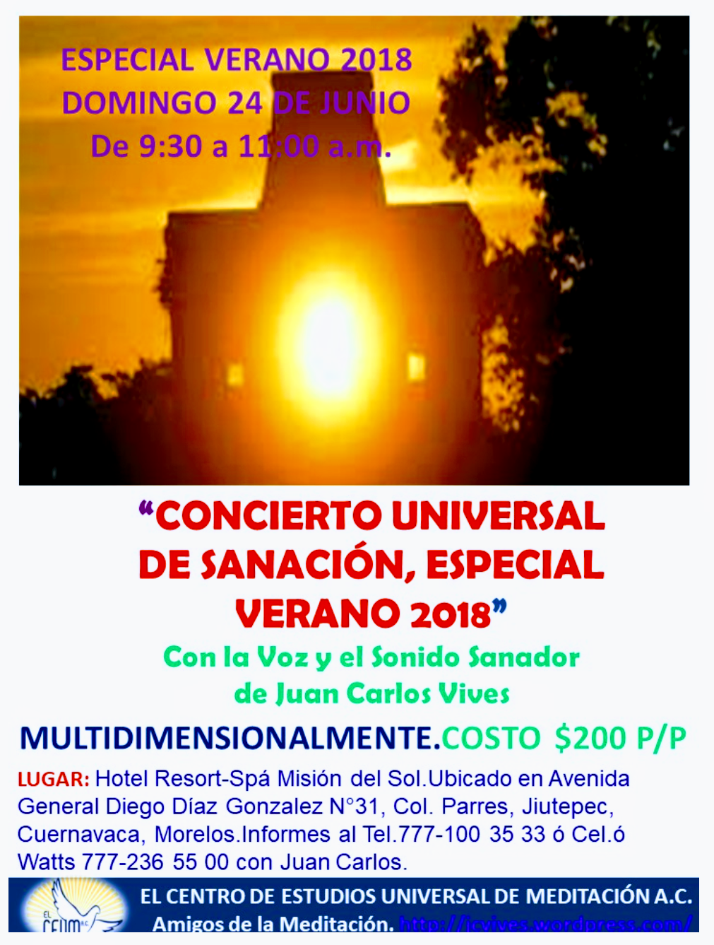 !!!!ATENCIÓN VIBRANDO ALTO Y PROFUNDO!!!! DOMINGO 24 DE JUNIO DE 9:30 A 11:00HS.( antes de la Meditación,) ”CONCIERTO DE SANACIÓN, ESPECIAL INICIO DE VERANO 2018″, con la Voz sanadora de Juan Carlos Vives. En el Hotel Resort Spa Misión del Sol. Cuernavaca Morelos. !!! COMPÁRTELO AL INFINITO!!! Link: https://wp.me/P17S2X-WJ
