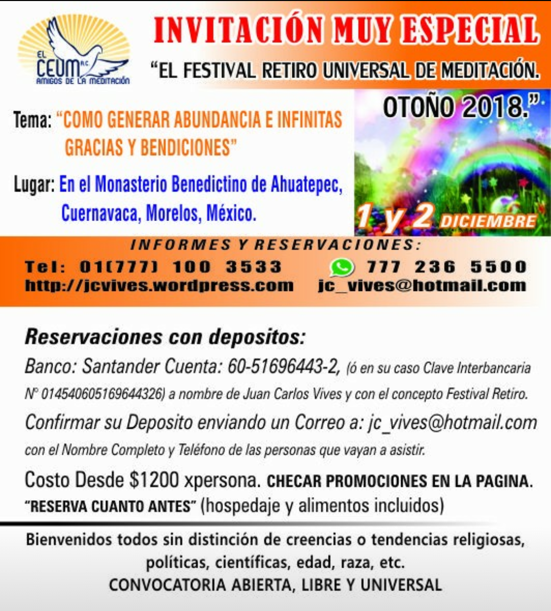 ¡¡¡¡ANÍMATE Y AVENTÚRATE!!!!FESTIVAL RETIRO UNIVERSAL DE MEDITACIÓN. OTOÑO 2018.Diciembre 01 y 02. Ahuatepec.Cuernavaca.Morelos. México.TEMA:”COMO GENERAR ABUNDANCIA E INFINITAS GRACIAS Y BENDICIONES.”: https://jcvives.wordpress.com/cosechar-abundancia-festival-retiro-universal-otono-2018-01-y-02-diciembre-morelos-mexico/