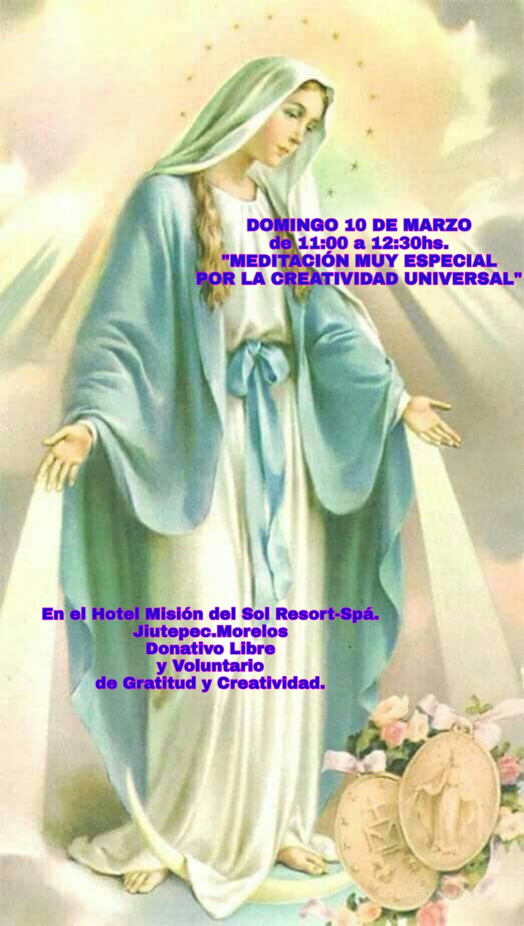 !!!!Y ATENCIÓN YA REGRESAMOS CON TODO!!!! Este Domingo 10 de Marzo “MEDITACIÓN Y SANACIÓN ESPECIAL POR LA CREATIVIDAD UNIVERSAL” de 11:00 a 12:30 hs. en El Hotel Misión del Sol Resort-Spá con la Guía Maestra del CEUM y Juan Carlos Vives Ivars. Entrada Libre, se sugiere Donativo Libre y Voluntario de Gratitud y Abundancia.