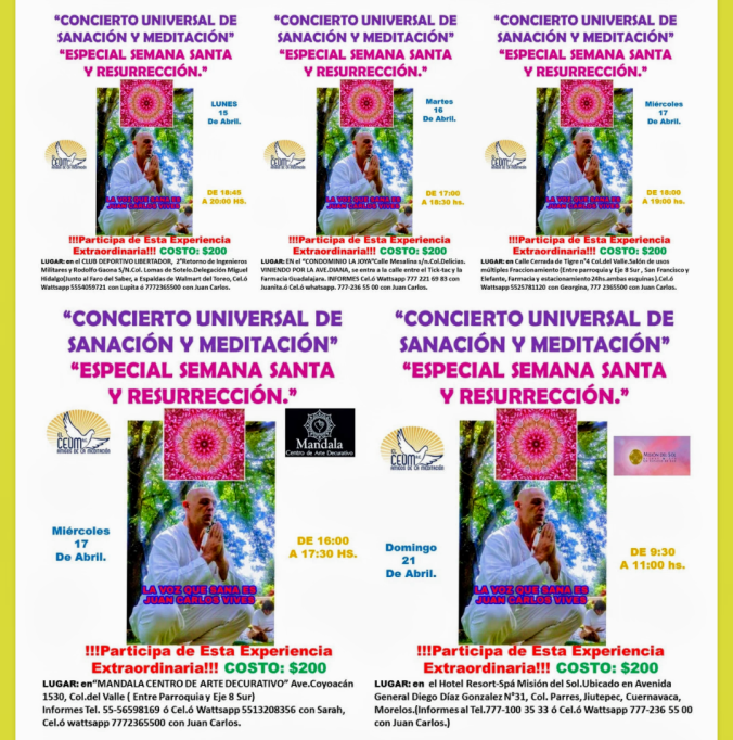 !!! RECUERDA YA MAÑANA LUNES 15 EN EL GRUPO DE LOMAS DE SOTELO !!!CONCIERTO DE MEDITACIÓN Y SANACIÓN CON PROPÓSITO ESPECIAL DE SEMANA SANTA Y RESURRECCIÓN. LA VOZ QUE SANA ES JUAN CARLOS VIVES INFORMACIÓN COMPLETA Y RESEÑAS EN: https://wp.me/P17S2X-WJ