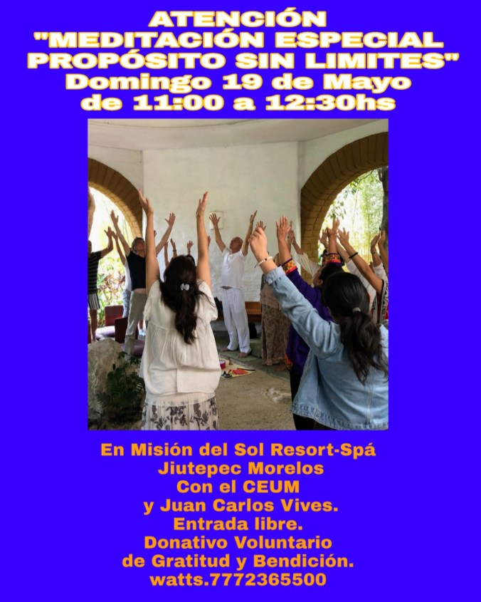 Y por allí nos vemos…!!!!IMPERDIBLE. !!!! DOMINGO 19 DE MAYO de 11:00 a 12:30 hs. "MEDITACIÓN-SANACIÓN ESPECIAL DE PROPÓSITO SIN LÍMITES" con Juan Carlos Vives y el CEUM, en El Hotel Misión del Sol Resort-Spá Jiutepec Morelos. Entrada Libre, se reciben Donativos Libres y Voluntarios de Gratitud y Abundancia.