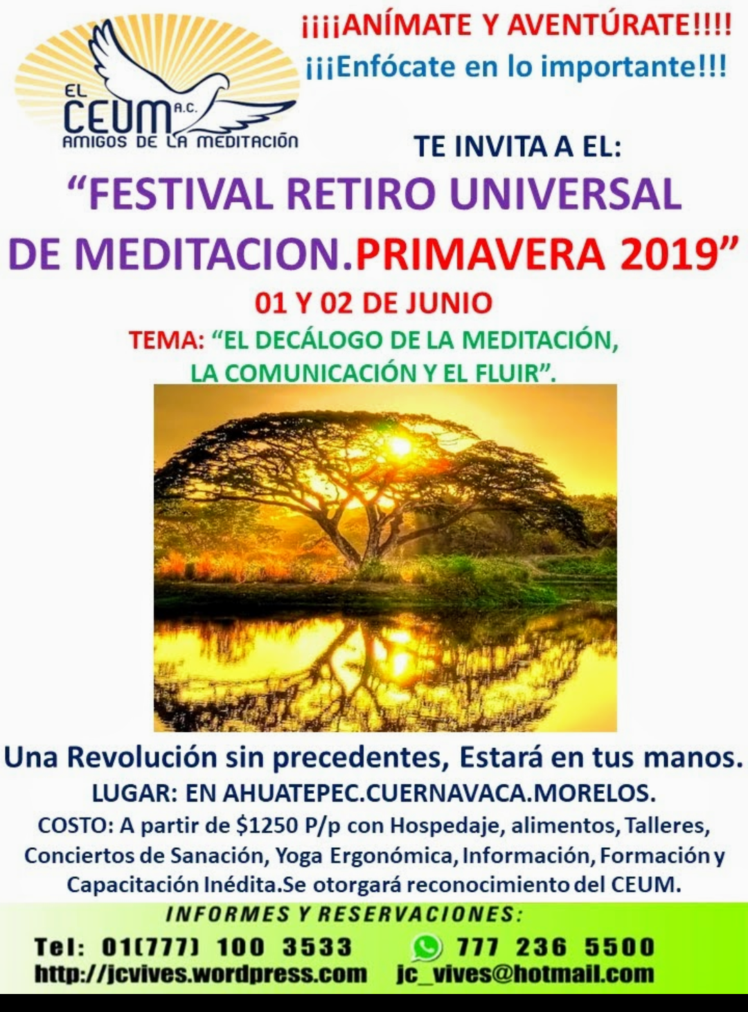 ¡¡¡¡ANÍMATE Y AVENTÚRATE!!! ENFÓCATE EN LO IMPORTANTE. FESTIVAL RETIRO UNIVERSAL DE MEDITACIÓN.PRIMAVERA 2019.Junio 01 y 02. Ahuatepec.Cuernavaca.Morelos. México.TEMA:”EL DECÁLOGO DE LA MEDITACIÓN, LA COMUNICACIÓN Y EL FLUIR.”Información Completa en: https://wp.me/P17S2X-371