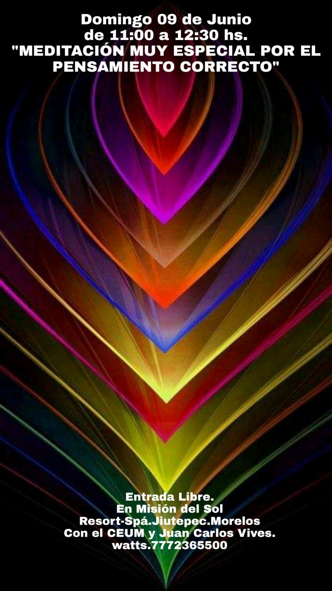 Este Domingo 09 de Junio de 11:00 a 12:30 hs. «MEDITACIÓN Y SANACIÓN ESPECIAL POR EL PENSAMIENTO CORRECTO» Con la guía Maestra del CEUM y Juan Carlos Vives. En el Hotel Misión del Sol Resort-Spá Jiutepec Morelos. Entrada Libre, se sugiere Donativo Libre y Voluntario de gratitud y Prosperidad.