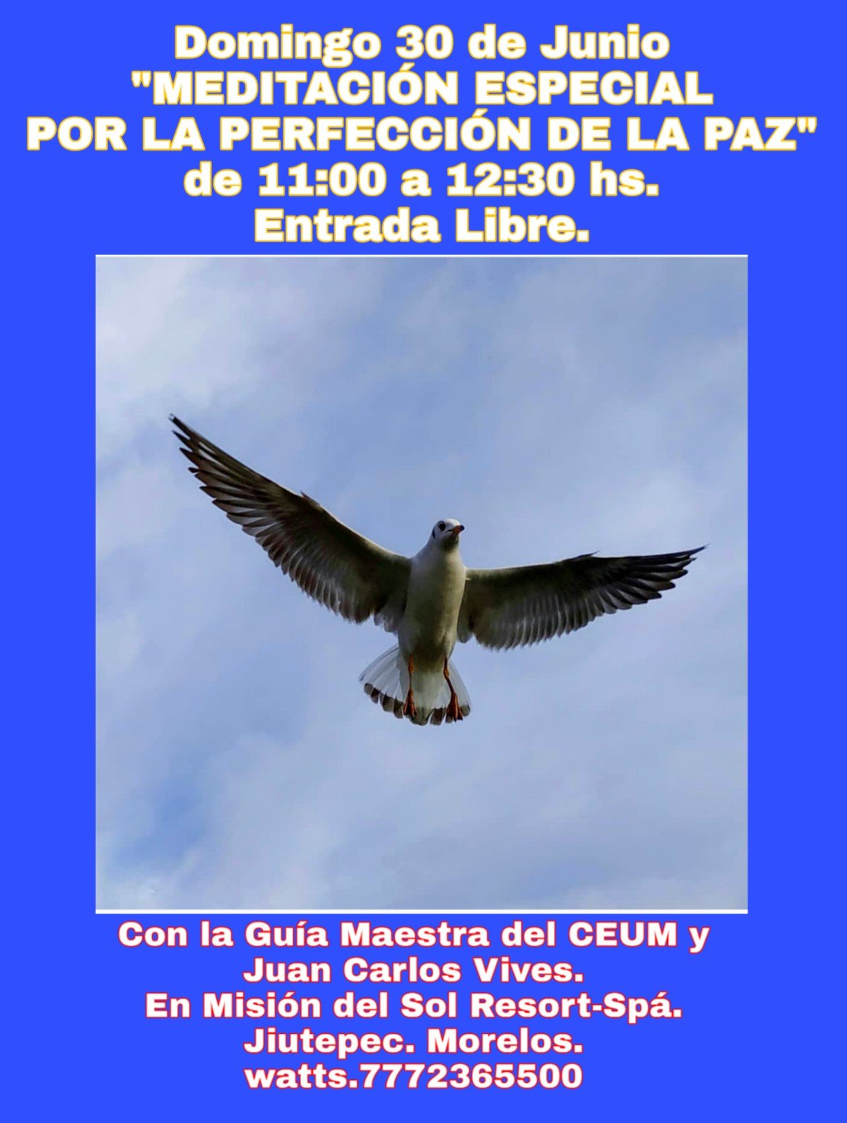Este Domingo 30 de Junio de 11:00 a 12:30 hs. «MEDITACIÓN MUY ESPECIAL POR LA PERFECCIÓN DE LA PAZ» Con la guía Maestra del CEUM y Juan Carlos Vives. En el Hotel Misión del Sol Resort-Spá Jiutepec Morelos. Entrada Libre, se sugiere Donativo Libre y Voluntario de gratitud y Prosperidad.