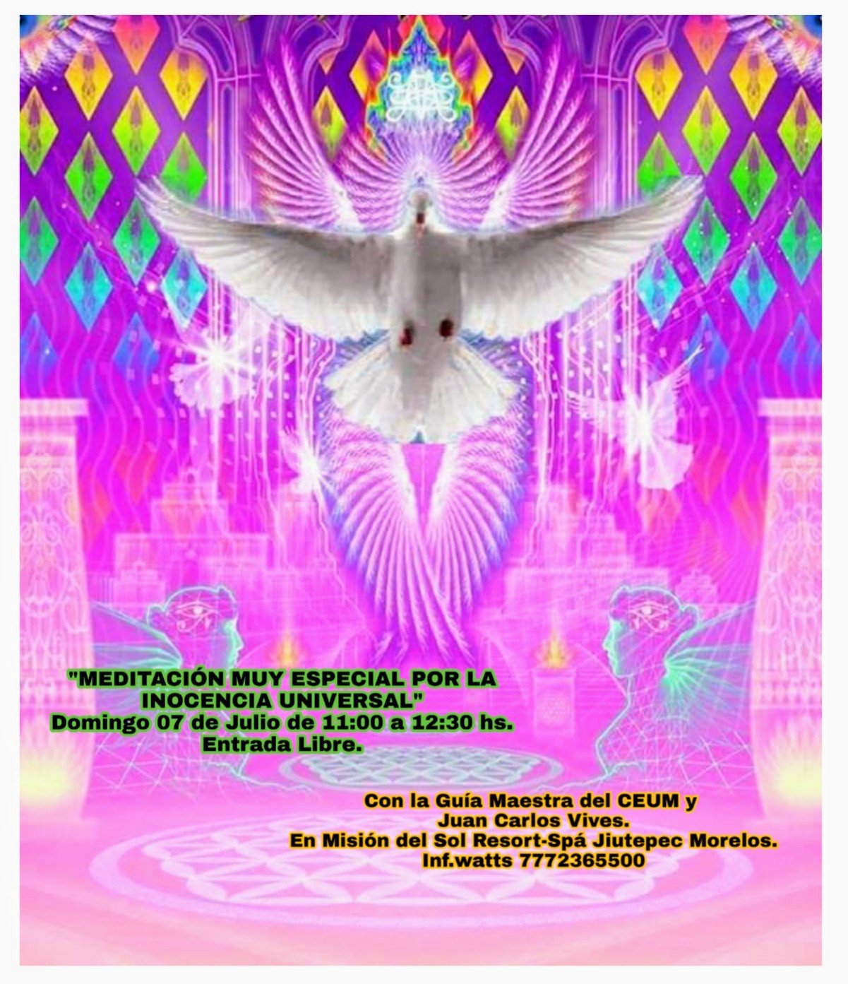 Este Domingo 07 de Julio de 11:00 a 12:30 hs. «MEDITACIÓN Y SANACIÓN MUY ESPECIAL POR LA INOCENCIA UNIVERSAL» Con la guía Maestra del CEUM y Juan Carlos Vives. En el Hotel Misión del Sol Resort-Spá Jiutepec Morelos. Entrada Libre, se sugiere Donativo Libre y Voluntario de gratitud y Prosperidad.
