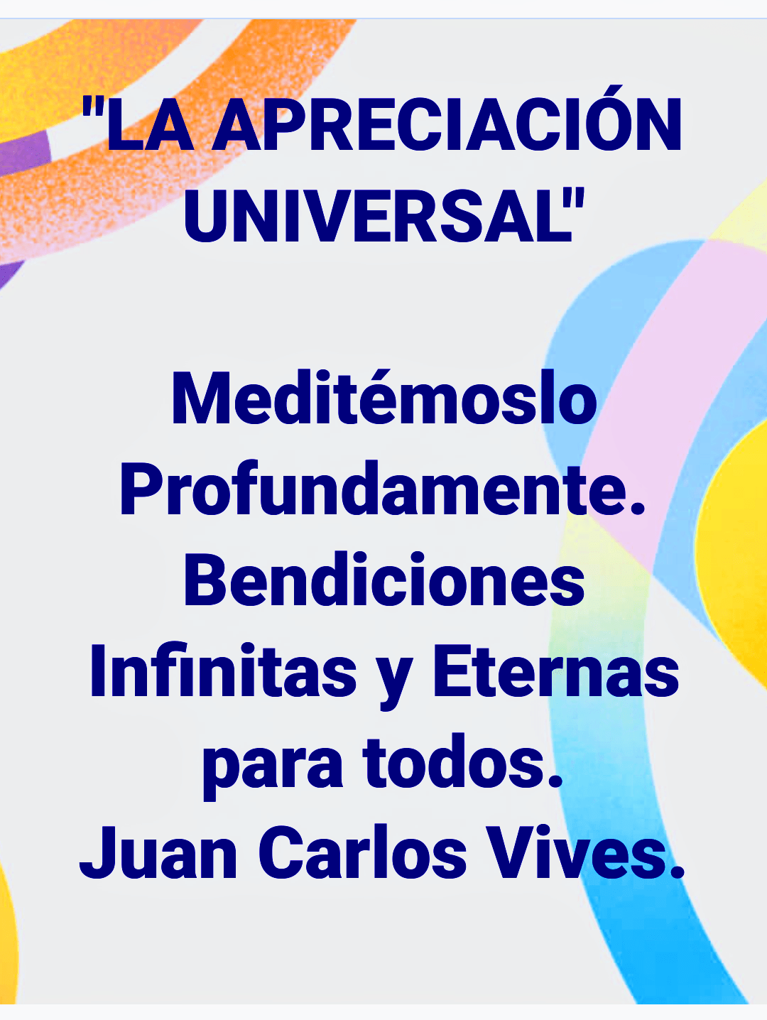 Queridos amigos todos. Un Cordial Saludo Universal, compartiendo la Paz de Nuestra Presencia y la Apreciación Universal, esta semana habrá Meditación y Sanación Especial por “ LA APRECIACIÓN UNIVERSAL” en todos los grupos del Directorio del CEUM (Por Donativo Libre y Voluntario de Gratitud:https://jcvives.wordpress.com/directorio-de-lugares-y-grupos-de-meditacion-del-ceum/), Así como Yoga Ergónomica Especial en los grupos correspondientes (Clase de Prueba gratis:https://jcvives.wordpress.com/directorio-de-clases-de-yoga-ergonomica-con-meditacion-activa-del-maestro-juan-carlos-vives-ivars-en-el-hotel-resort-spa-mision-del-sol-y-otros-lugares/). Infinitas Gracias y Bendiciones Eternas de Inocencia y Perdón para todos.