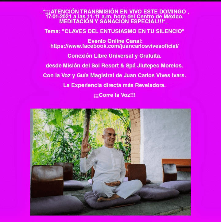 _*¡¡¡ATENCIÓN TRANSMISIÓN EN VIVO ESTE DOMINGO , 17-01-2021 a las 11:11 a.m. hora del Centro de México. MEDITACIÓN Y SANACIÓN ESPECIAL!!!*_ Tema: «CLAVES DEL ENTUSIASMO EN TU SILENCIO» Evento Online Canal: https://www.facebook.com/juancarlosvivesoficial/