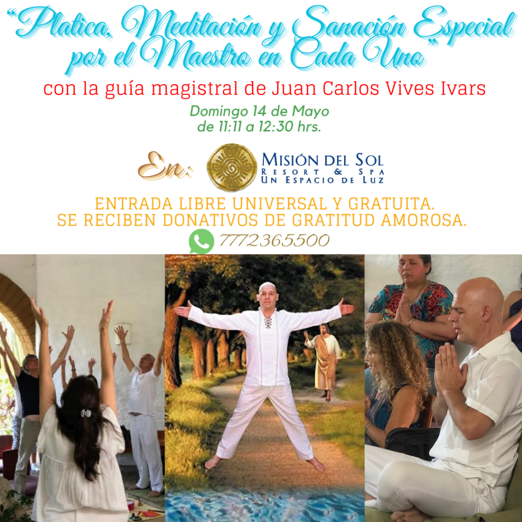 Atención Mañana Domingo 14 de Mayo de 11:11 a 12:30hs.»PLÁTICA MEDITACIÓN Y SANACIÓN ESPECIAL POR EL MAESTRO EN CADA UNO »Con la Guía Magistral y Ceremonial, la Voz y el Sonido Sanador de Juan Carlos Vives Ivars Fundador de El Centro de Estudios Universal de Meditación A.C.LUGAR: Misión del Sol Resort y Spá. Cuernavaca Morelos.