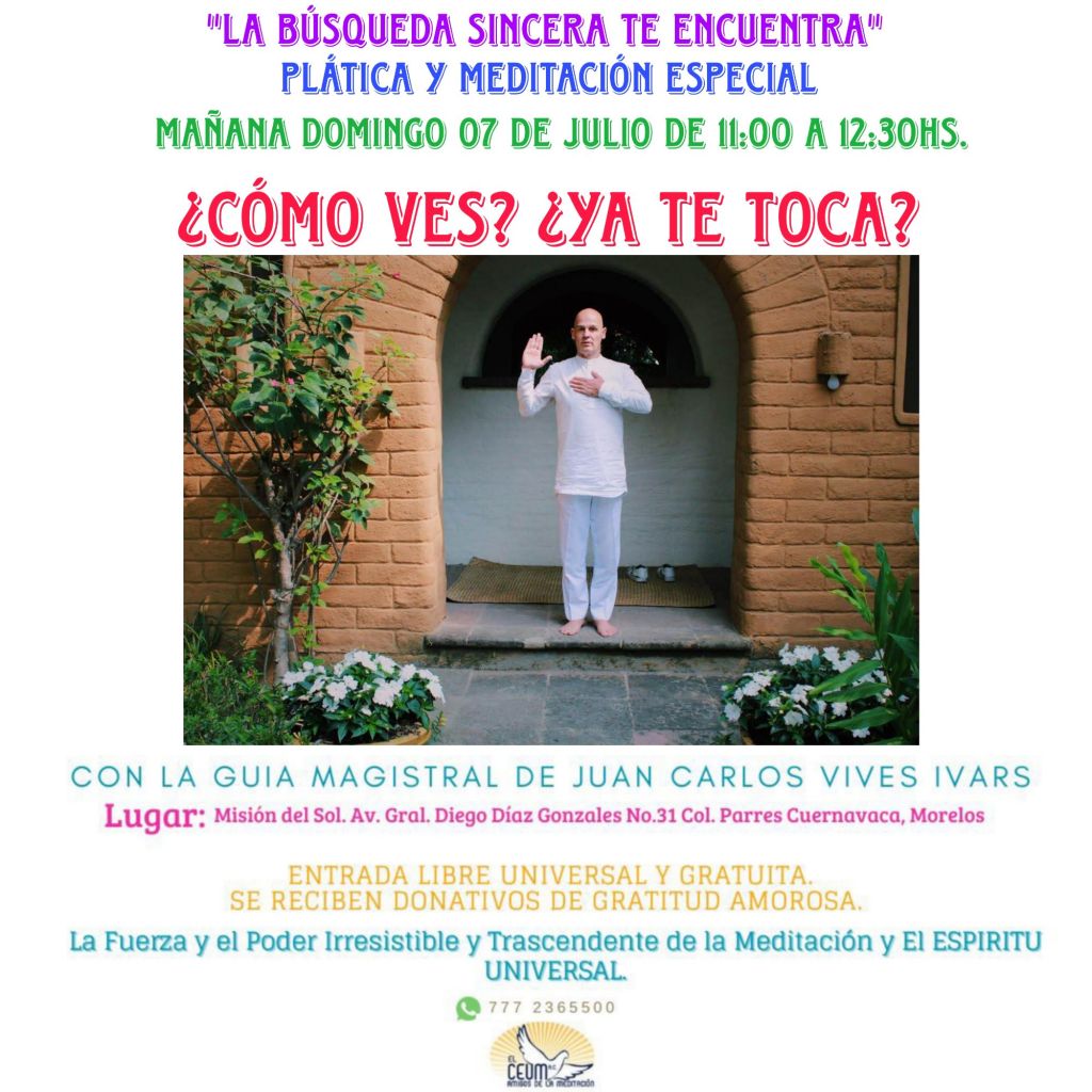 «LA BÚSQUEDA SINCERA TE ENCUENTRA»PLÁTICA Y MEDITACIÓN ESPECIAL¿Cómo ves? ¿Ya te toca?Domingo 07 de Julio de 11:00 a.m. A 12:30 hs.LUGAR: Misión del Sol Resort y Spá. Cuernavaca Morelos. IMPARTE: Juan Carlos Vives Ivars Fundador de El Centro de Estudios Universal de Meditación A.C.ENTRADA LIBRE UNIVERSAL Y GRATUITA.