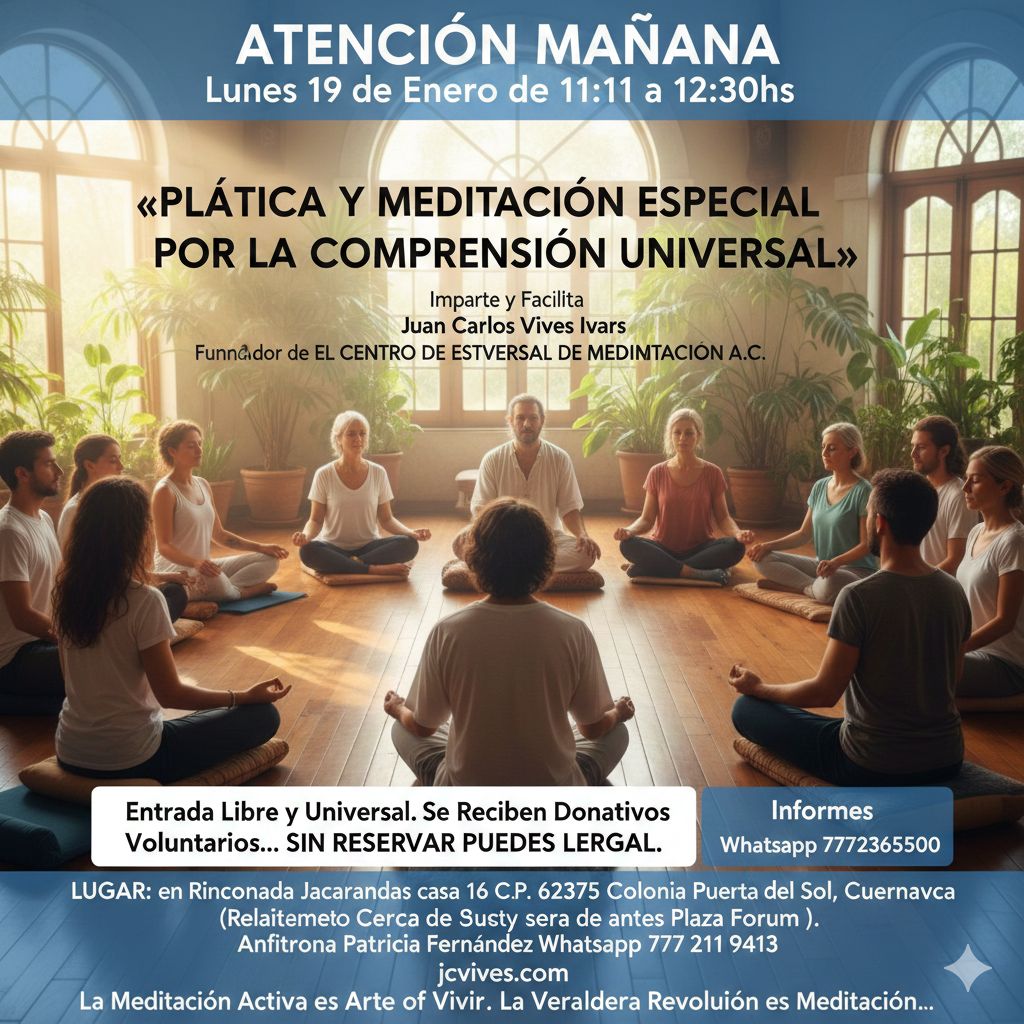 ATENCIÓN MAÑANA   Lunes 19 de Enero de 11:11 a 12:30hs.   «PLÁTICA Y MEDITACIÓN ESPECIAL POR LA COMPRENSIÓN UNIVERSAL»   Imparte y Facilita Juan Carlos Vives Ivars Fundador de EL CENTRO DE ESTUDIOS UNIVERSAL DE MEDITACIÓN A.C…. En Cuernavaca. Morelos.