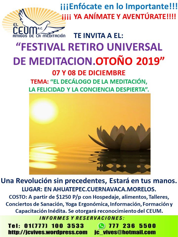 ¡¡¡¡YA ANÍMATE Y AVENTURATE!!!!Enfócate en lo Importante. FESTIVAL RETIRO UNIVERSAL DE MEDITACIÓN.OTOÑO 2019.Diciembre 07 y 08.Ahuatepec.Cuernavaca.Morelos.México.TEMA:” EL DECÁLOGO DE LA MEDITACIÓN, LA FELICIDAD Y LA CONCIENCIA DESPIERTA.”Información completa: https://wp.me/P17S2X-371