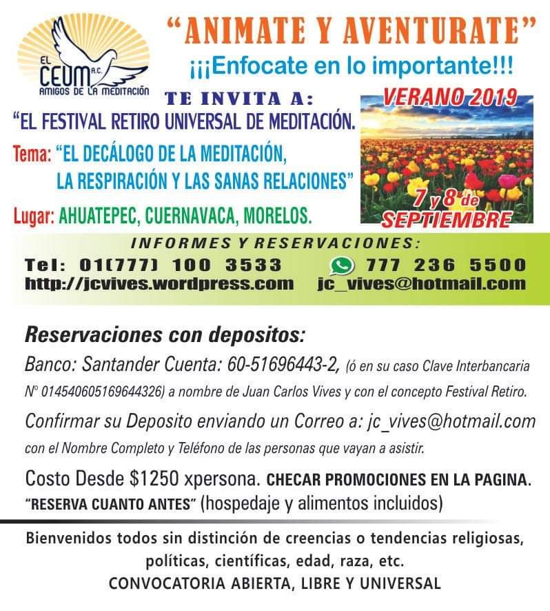YA ESTAMOS EN MARCHA ¡¡¡¡ANÍMATE Y AVENTÚRATE!!!!Enfócate en lo Importante. FESTIVAL RETIRO UNIVERSAL DE MEDITACIÓN.VERANO 2019. Septiembre 07 y 08. Ahuatepec.Cuernavaca.Morelos. México.TEMA:”EL DECÁLOGO DE LA MEDITACIÓN, LA RESPIRACIÓN Y LAS SANAS RELACIONES.”Información Completa en: https://wp.me/P17S2X-371