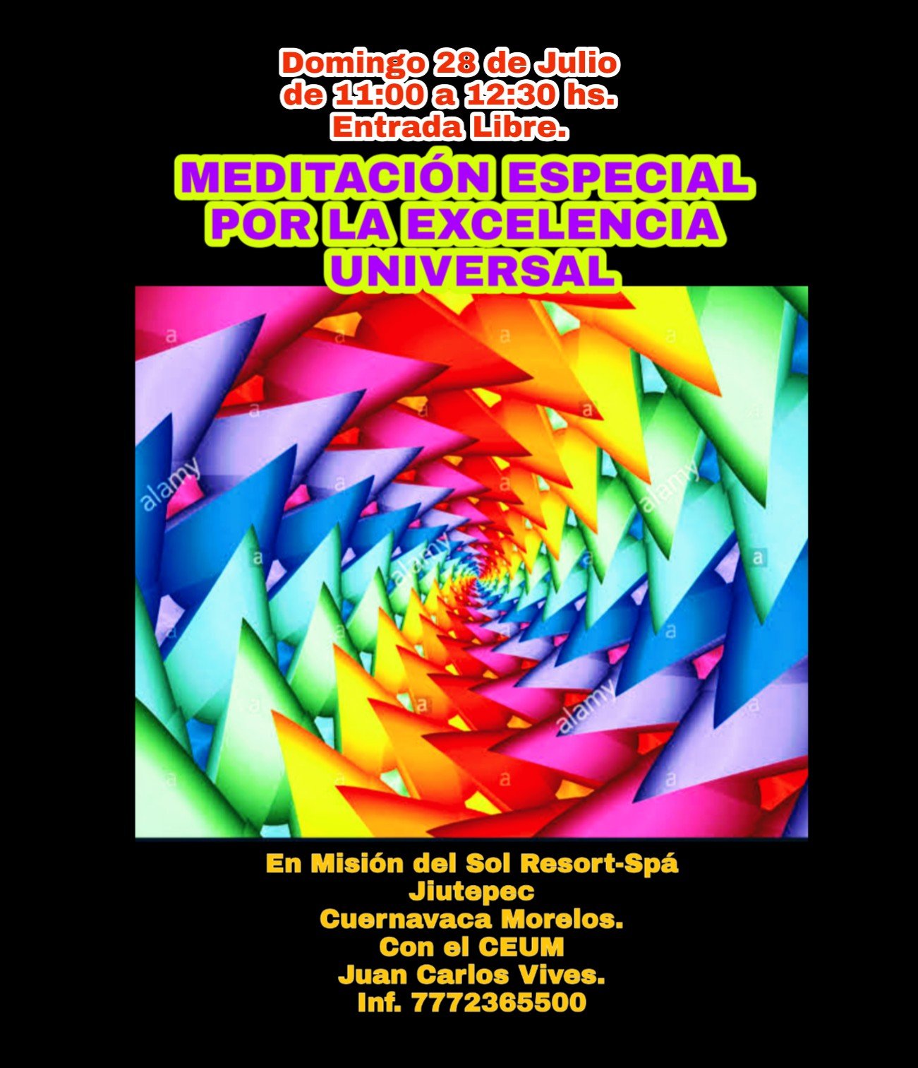 RECUERDA LO MEJOR DE ESTE FIN DE SEMANA. Domingo 28 de Julio de 11:00 a 12:30 hs. «MEDITACIÓN Y SANACIÓN MUY ESPECIAL POR LA EXCELENCIA UNIVERSAL» Con la guía Maestra del CEUM y Juan Carlos Vives. En el Hotel Misión del Sol Resort-Spá Jiutepec Morelos. Entrada Libre, se sugiere Donativo Libre y Voluntario de gratitud y Prosperidad.