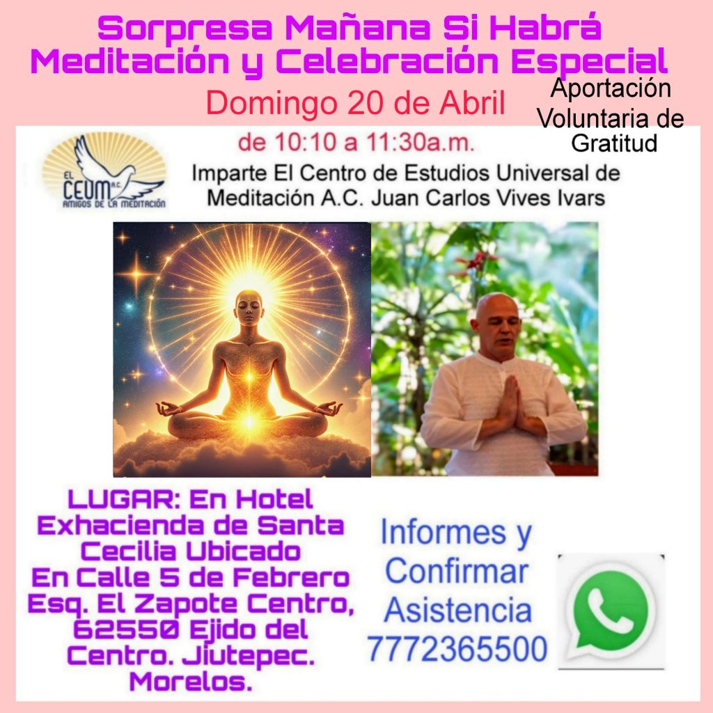 ATENCIÓN MAÑANA Domingo 20 de Abril SÍ HABRÁ MEDITACIÓN Y CELEBRACIÓN ESPECIAL. » LA RESURRECCIÓN ES INEVITABLE» Expansión de Conciencia, Salud, Alegría, Prosperidad, Sanación. Seguimos Convocando, Invitando. MEDITACIÓN OPORTUNA Y DESARROLLO HUMANO PERMANENTE con Juan Carlos Vives Ivars Fundador del CEUM y Recopilador del Decálogo de la Meditación.Todos los Domingos de 10:10 a 11:30hs. en El Hotel Exhacienda de Santa Cecilia, Calle 5 de Febrero Esq. El Zapote Centro, 62550 Ejido del Centro.( Ubicación Google: https://g.co/kgs/T2GyPT1 ) Informes Whatsapp 7772365500