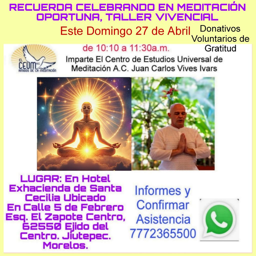 ATENCIÓN ESTE Domingo 27 de Abril CELEBRANDO EN MEDITACIÓN OPORTUNA,TALLER VIVENCIAL.» Expansión de Conciencia, Salud, Alegría, Prosperidad, Sanación. Seguimos Convocando, Invitando. MEDITACIÓN OPORTUNA Y DESARROLLO HUMANO PERMANENTE con Juan Carlos Vives Ivars Fundador del CEUM y Recopilador del Decálogo de la Meditación.Todos los Domingos de 10:10 a 11:30hs. en El Hotel Exhacienda de Santa Cecilia, Calle 5 de Febrero Esq. El Zapote Centro, 62550 Ejido del Centro. Jiutepec. Morelos. ( Ubicación Google: https://g.co/kgs/T2GyPT1 ) Informes Whatsapp 7772365500