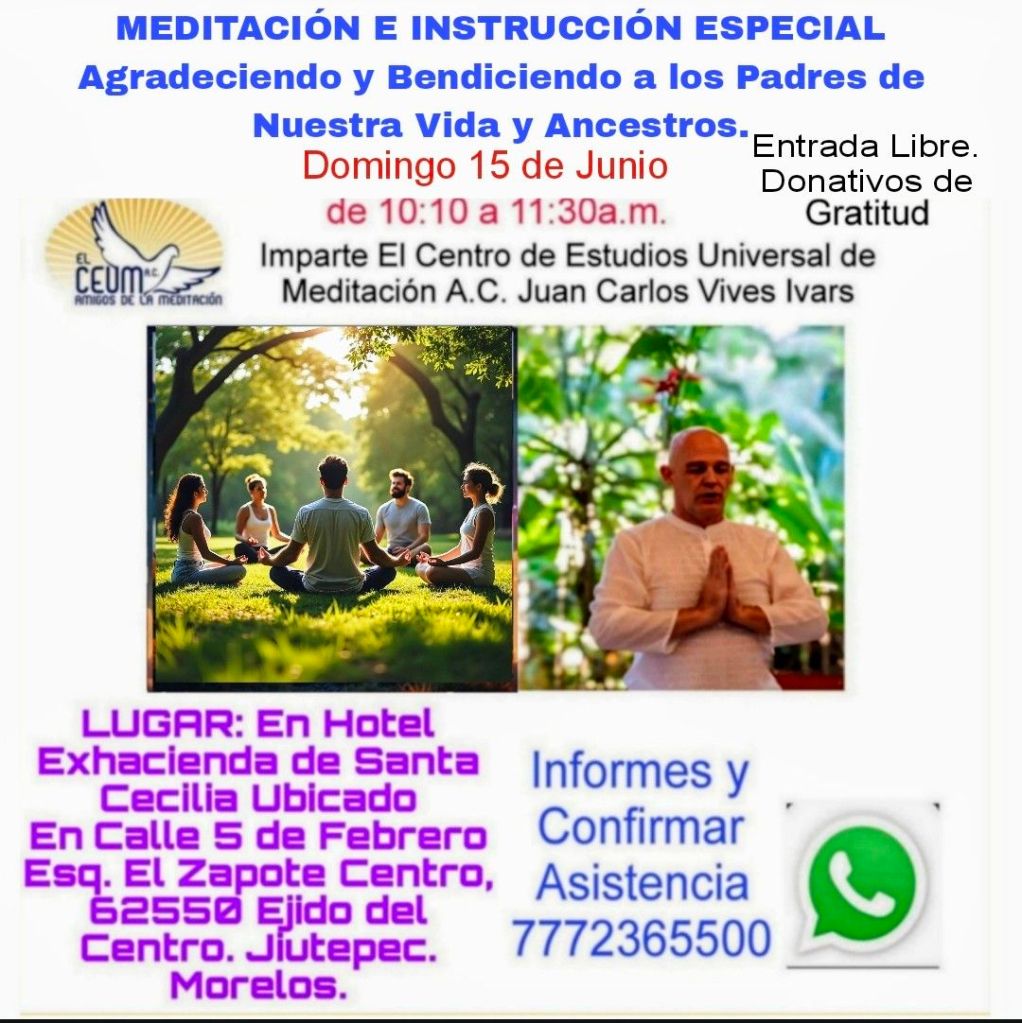 ESTE DOMINGO 20 DE JULIO MEDITACIÓN E INSTRUCCION ESPECIAL. Desde la Expansion de Conciencia, Salud, Alegría, Prosperidad, Sanación. Seguimos Convocando, Invitando. TALLER VIVENCIAL PERMANENTE DE MEDITACIÓN OPORTUNA Y DESARROLLO HUMANO con Juan Carlos Vives Ivars Fundador del CEUM y Recopilador del Decálogo de la Meditación.LUGAR: en El Hotel Exhacienda de Santa Cecilia, Calle 5 de Febrero Esq. El Zapote Centro, 62550 Ejido del Centro.( Ubicación Google: https://g.co/kgs/T2GyPT1 ) Informes Whatsapp 7772365500