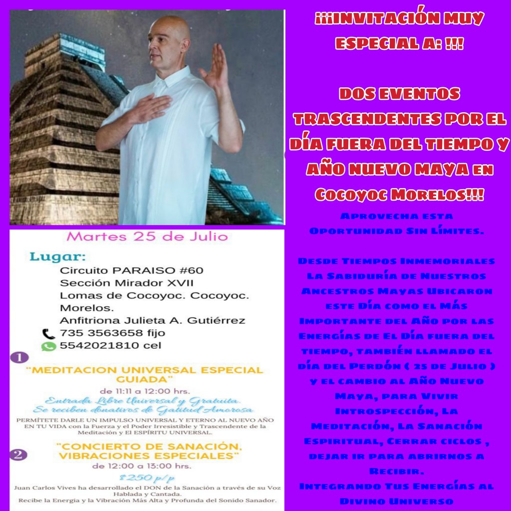 Desde Tiempos Inmemoriales La Sabiduría de Nuestros Ancestros Mayas Ubicaron este Día como el Más Importante del Año por las Energías de El Día fuera del tiempo, también llamado el día del Perdón ( 25 de Julio ) y el cambio al Año Nuevo Maya, para Vivir Introspección, La Meditación, La Sanación Espiritual, Cerrar ciclos , dejar ir para abrirnos a Recibir. Integrando Tus Energías al Divino Universo con una Hermosa MEDITACIÓN Y CONCIERTO 🎵