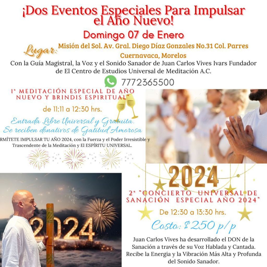PERMÍTETE IMPULSAR TU AÑO 2024, con la Fuerza y el Poder Irresistible y Trascendente de la Meditación y El ESPÍRITU UNIVERSAL. APROVECHA la Energía del Propósito Universal é Infinito, que se manifiesta ahí en todo su Esplendor. Una Celebración Sin Limites y MILAGROS a nivel Material, Emocional y Espiritual por la Fuerza de la Comunión Universal. Habrá Brindis Espiritual Universal. Informes Whatsapp 7772365500