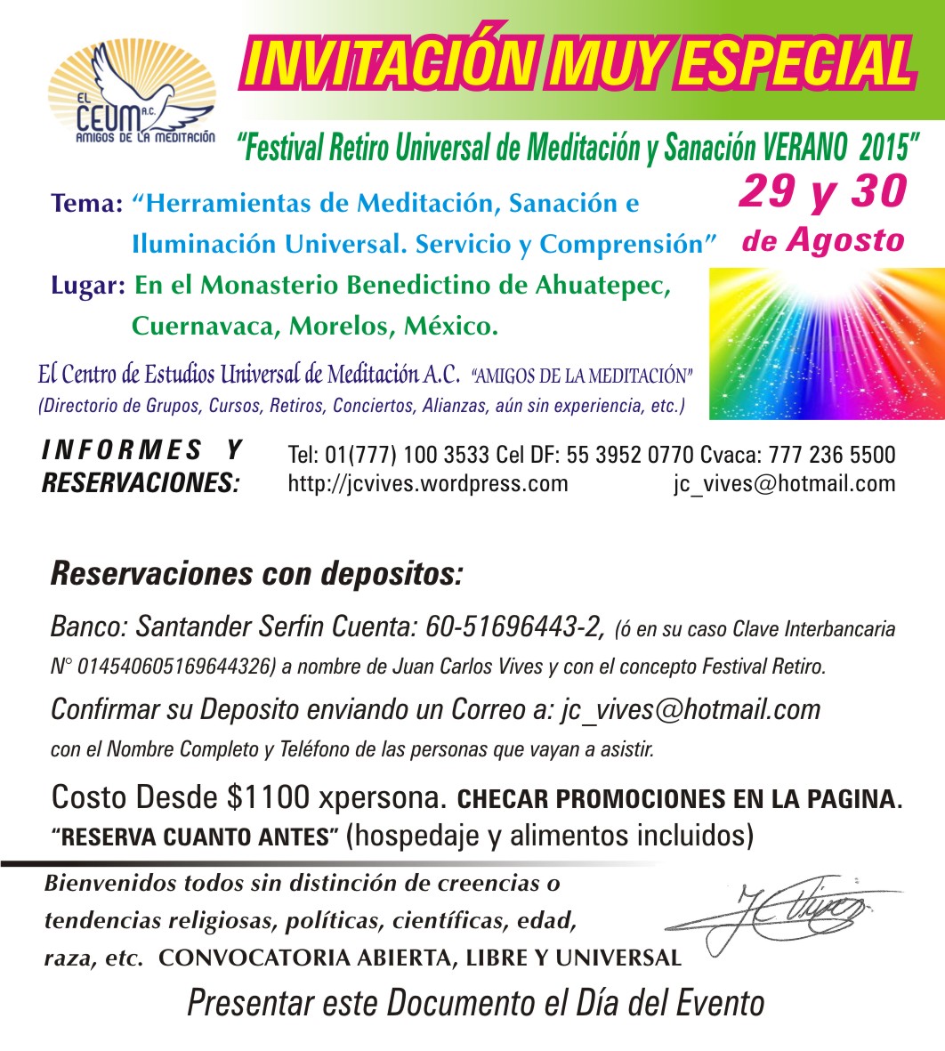 ATENCIÓN ”MEDITACIÓN Y SANACIÓN ESPECIAL POR LA MISIÓN UNIVERSAL”TALLER en todos nuestros grupos semana del 7 al 13 de Agosto.Entrada Libre,Donativo Voluntario de Gratitud y Abundancia.Con la Guía Maestra de Juan Carlos Vives y El Centro de Estudios Universal de Meditación A.C.Hay Cambios.Checa donde y cuando en el DIRECTORIO de Grupos de Amigos de la Meditación, lugares y Diferentes Horarios.http://wp.me/P17S2X-5S