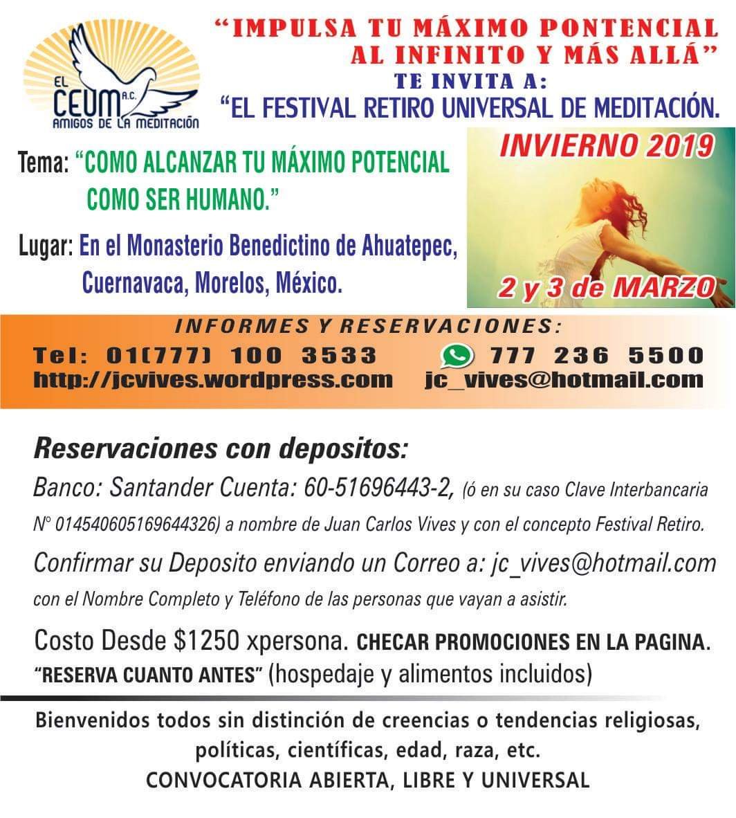 Pequeño Currículum de El Maestro Juan Carlos Vives Ivars. Español de nacimiento y universal por principio. Después de una gran travesía interior, y haber conocido varias tradiciones y Culturas, viajado a Egipto, la India, Argentina, México, conocido y participado de algunos movimientos iniciáticos, científico Espirituales, de haber fungido como Psicólogo, Terapeuta, Profesor de Yoga, y Meditación, etc… decide Fundar el 11-08-2006 El Centro de Estudios Universal de Meditación A.C. y comienza a formar los Grupos de Amigos de la Meditación. Dice que la Amistad y la Meditación son los que en Verdad pueden traer la Nueva Conciencia en Acción tan urgente y necesaria, para el Ser Humano y que una Nueva Humanidad Libre, Sana, Feliz, Pacífica y Universal se manifieste.