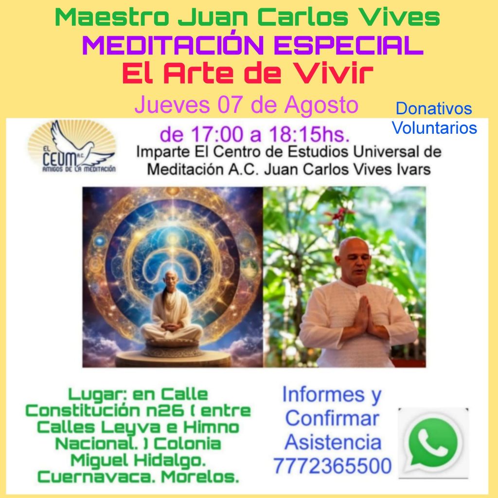 RECUERDA. Este Domingo 19 de Octubre de 11:11 a 12:30hs. «MEDITACIÓN OPORTUNA El Arte de Vivir» Donativos Voluntarios de Infinitas Gracias y Bendiciones. LUGAR: (YA Estamos en un Nuevo Espacio más Reservado donde Hay Silencio Ambiental para Meditar) en El Hotel Exhacienda de Santa Cecilia, Calle 5 de Febrero Esq. El Zapote Centro, 62550 Ejido del Centro. Jiutepec. Morelos ( Ubicación Google: https://g.co/kgs/T2GyPT1 ) Informes Whatsapp 7772365500
