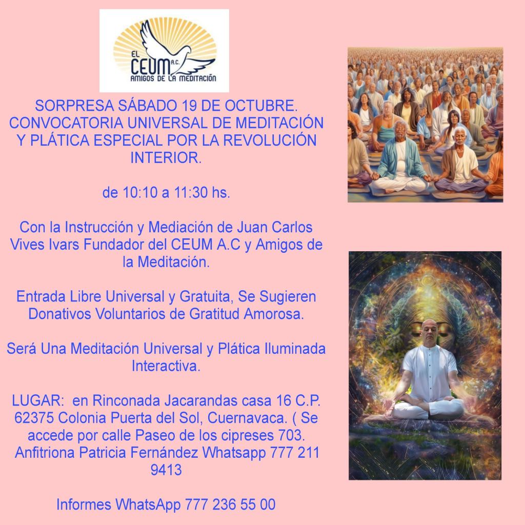 SORPRESA SÁBADO 19 DE OCTUBRE. CONVOCATORIA UNIVERSAL DE MEDITACIÓN Y PLÁTICA ESPECIAL POR LA REVOLUCIÓN INTERIOR.