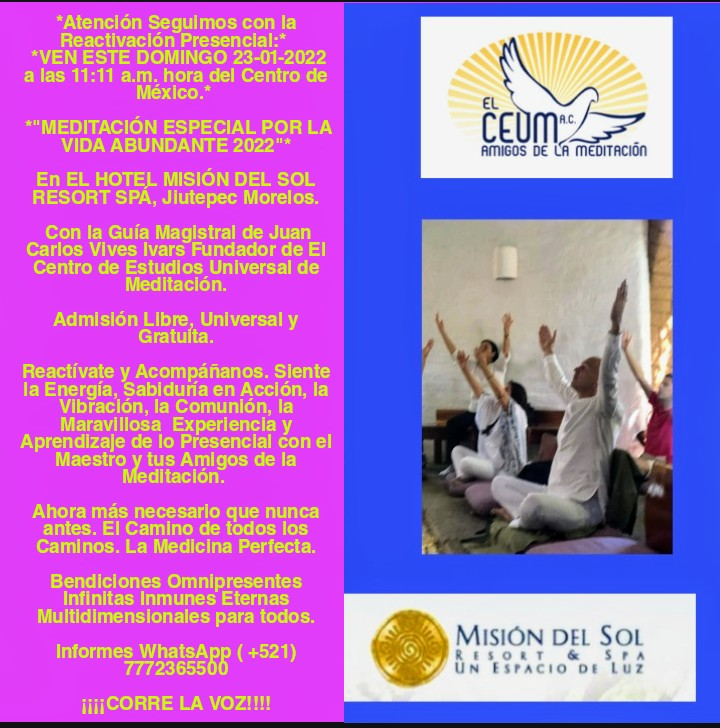 AVISOS «Habrá Meditación Presencial Especial de Fin de Año el Viernes 31 de Diciembre de 17:00 a 18:00 hs. y habrá Meditación Presencial Especial de Año Nuevo el Sábado 01 de Enero de 12:00 a 13:00 hs. y el Domingo 02 de Enero a las 11:11 a.m. hora del Centro de México. En Misión del Sol Resort y Spá. Con el Maestro Juan Carlos Vives Ivars. Participación Gratuita y Abierta.