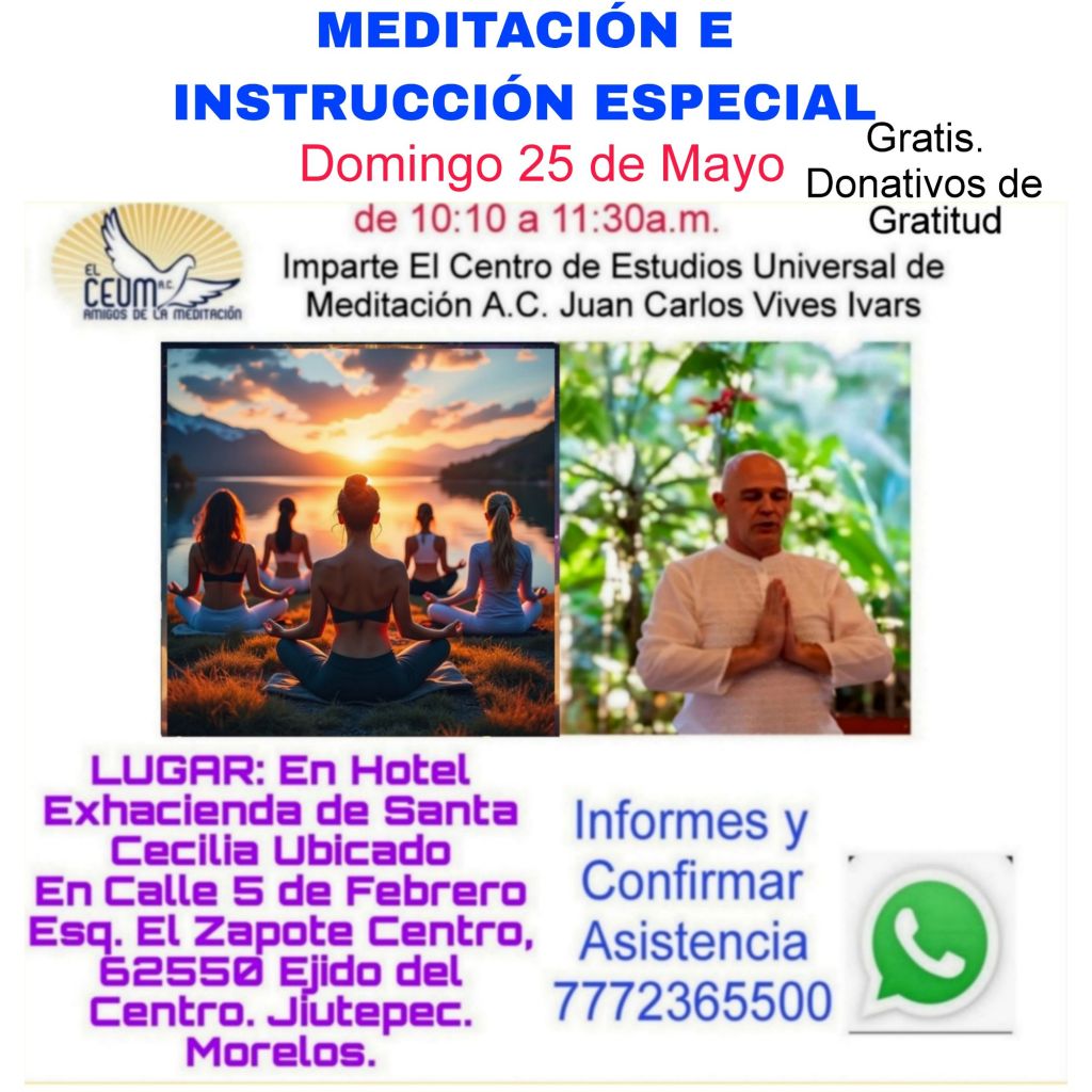 RECUERDA ESTE DOMINGO MEDITACIÓN E INSTRUCCION ESPECIAL. Expansion de Conciencia, Salud, Alegría, Prosperidad, Sanación. Seguimos Convocando, Invitando. TALLER VIVENCIAL PERMANENTE DE MEDITACIÓN OPORTUNA Y DESARROLLO HUMANO con Juan Carlos Vives Ivars Fundador del CEUM y Recopilador del Decálogo de la Meditación.Todos los Domingos de 10:10 a 11:30hs. en El Hotel Exhacienda de Santa Cecilia, Calle 5 de Febrero Esq. El Zapote Centro, 62550 Ejido del Centro.( Ubicación Google: https://g.co/kgs/T2GyPT1 ) Informes Whatsapp 7772365500