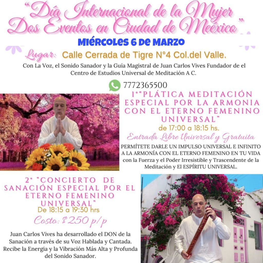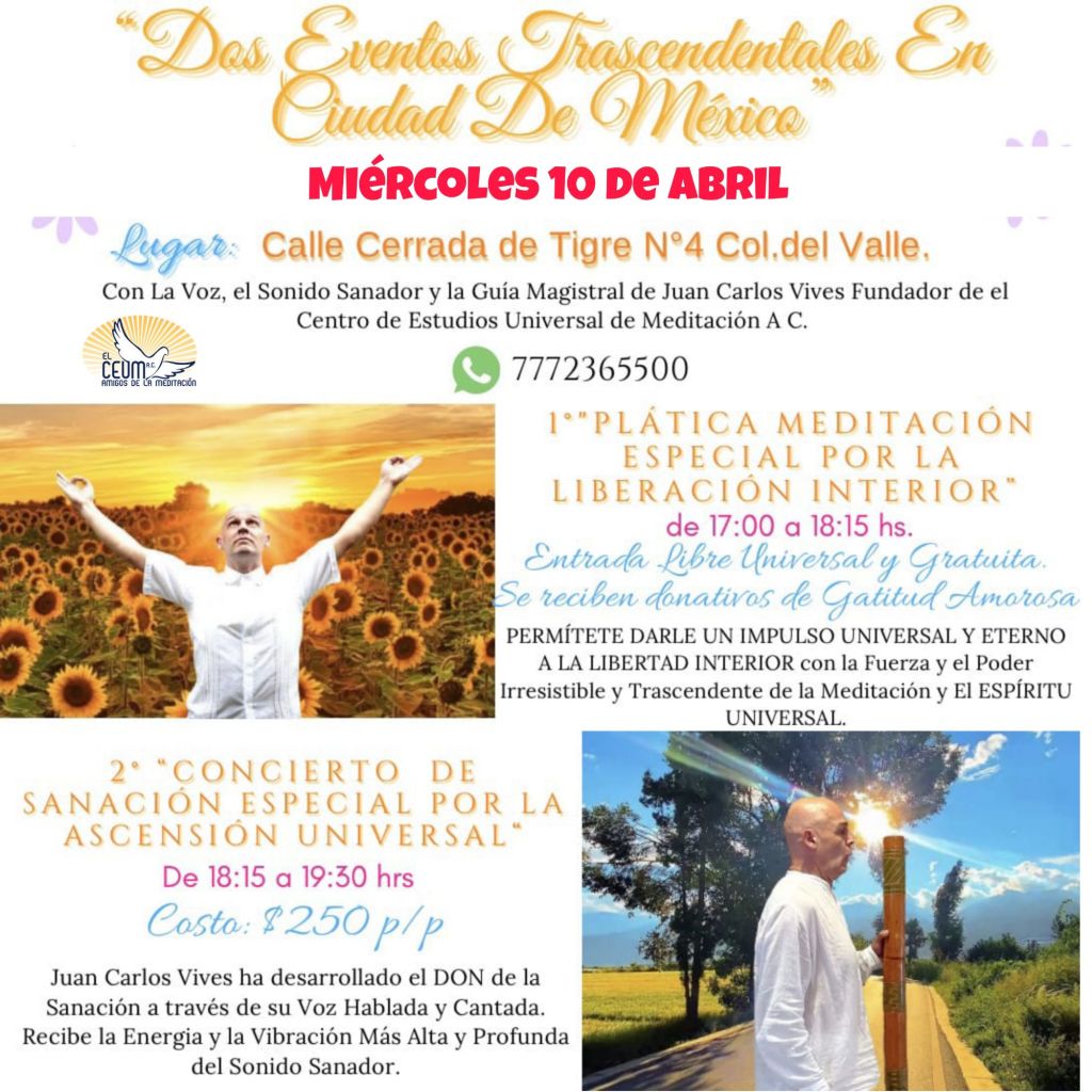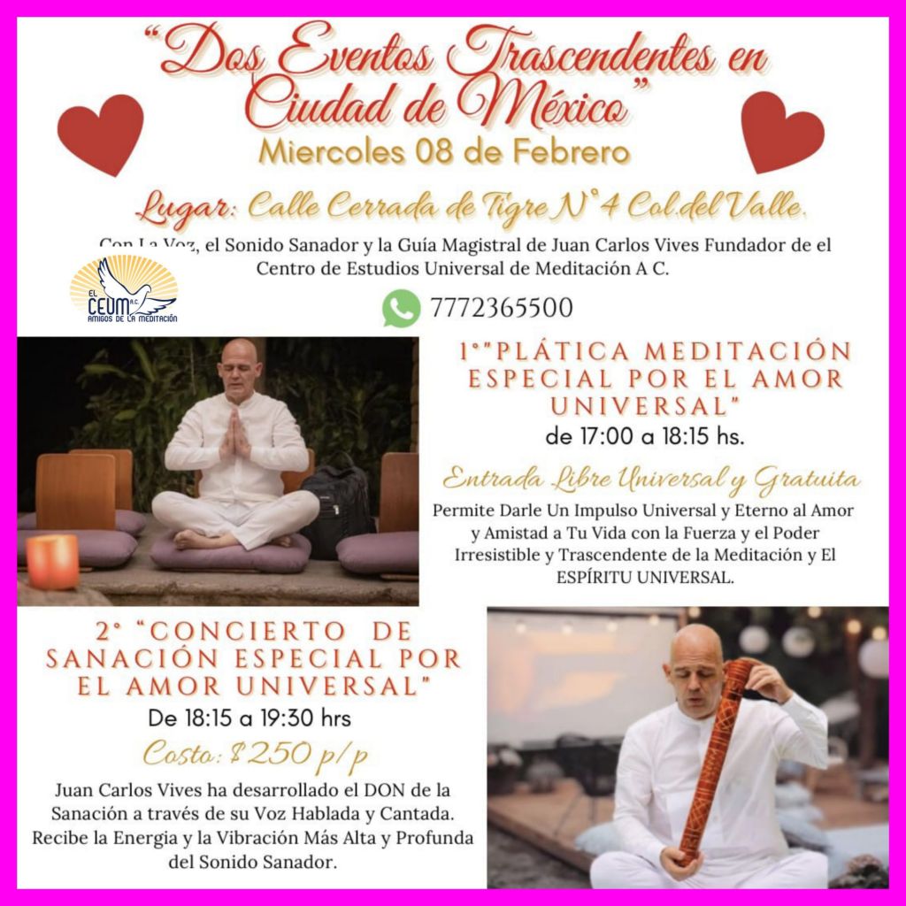 Con la Guía Magistral, la Voz y el Sonido Sanador de Juan Carlos Vives Ivars Fundador de El Centro de Estudios Universal de Meditación A.C. LUGAR:Calle Cerrada de Tigre N°4 Col.del Valle.( Entre San Francisco y Elefante Farmacia y Estacionamiento Público en las Esquinas de San Francisco)