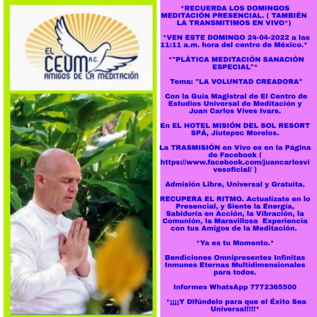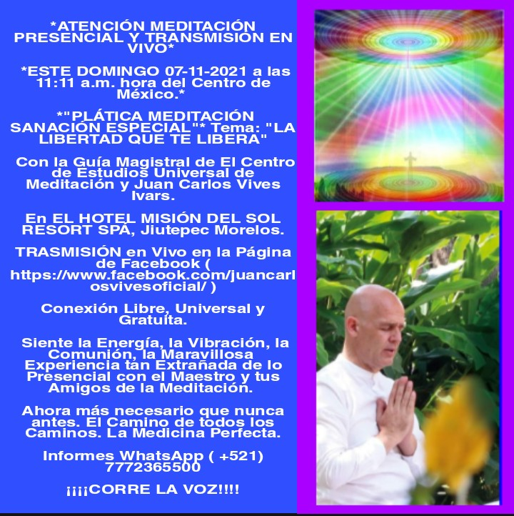 Admisión Libre, Universal y Gratuita. Siente la Energía, la Vibración, la Comunión, la Maravillosa Experiencia tan Extrañada de lo Presencial con el Maestro y tus Amigos de la Meditación.