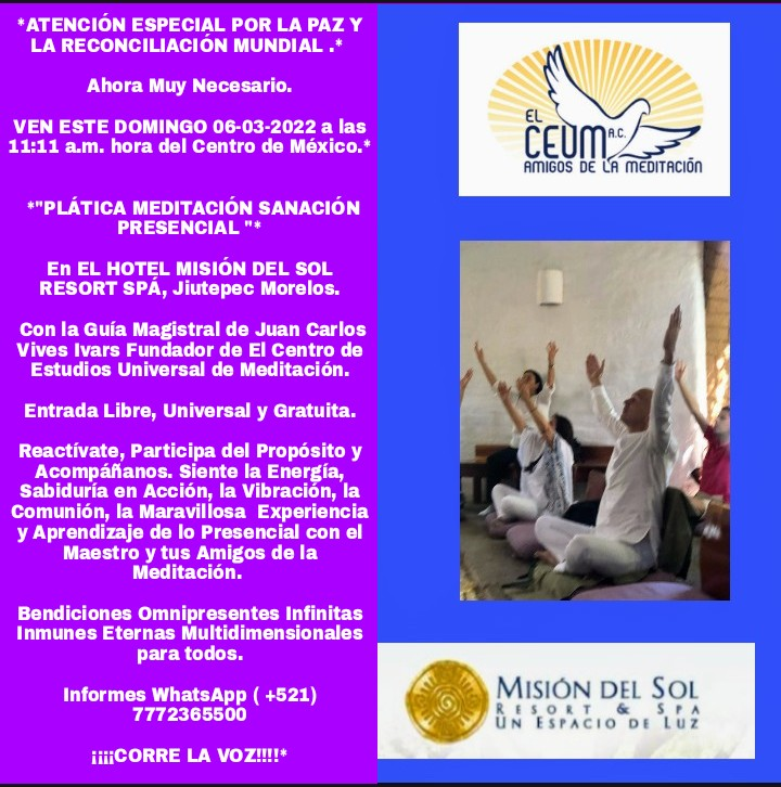 Reactívate, Participa del Propósito y Acompáñanos. Siente la Energía, Sabiduría en Acción, la Vibración, la Comunión, la Maravillosa Experiencia y Aprendizaje de lo Presencial con el Maestro y tus Amigos de la Meditación.