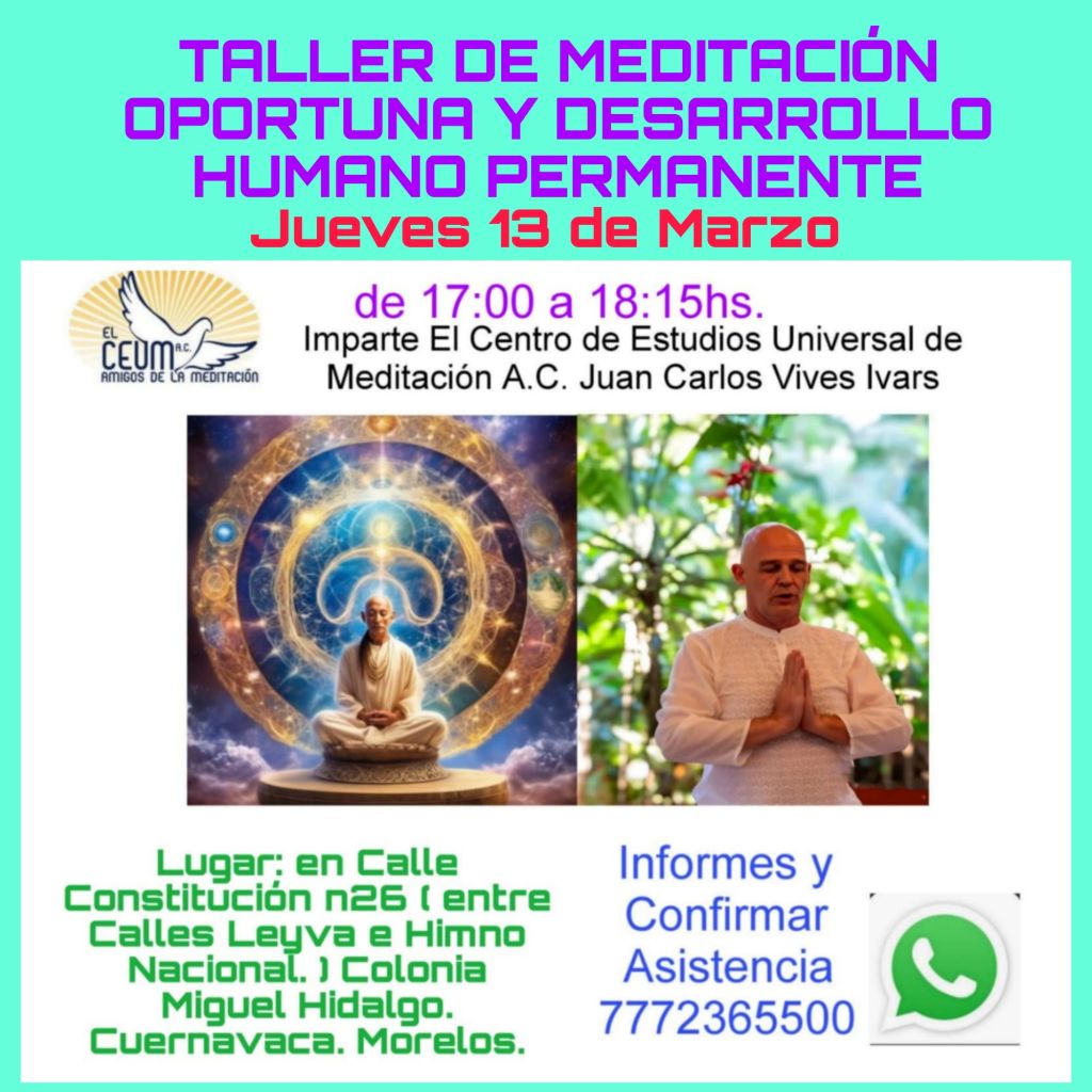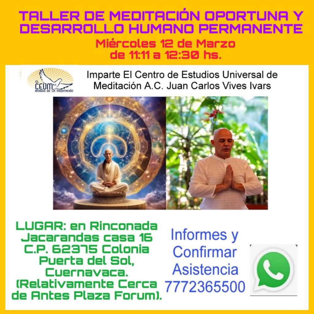 RECUERDA ESTE DOMINGO Expansion de Conciencia, Salud, Alegría, Prosperidad, Sanación. Seguimos Convocando, Invitando.TALLER VIVENCIAL PERMANENTE DE MEDITACIÓN OPORTUNA Y DESARROLLO HUMANO con Juan Carlos Vives Ivars Fundador del CEUM y Recopilador del Decálogo de la Meditación.Todos los Domingos de 10:10 a 11:30hs. en El Hotel Exhacienda de Santa Cecilia, Calle 5 de Febrero Esq. El Zapote Centro, 62550 Ejido del Centro.( Ubicación Google: https://g.co/kgs/T2GyPT1 ) Informes Whatsapp 7772365500