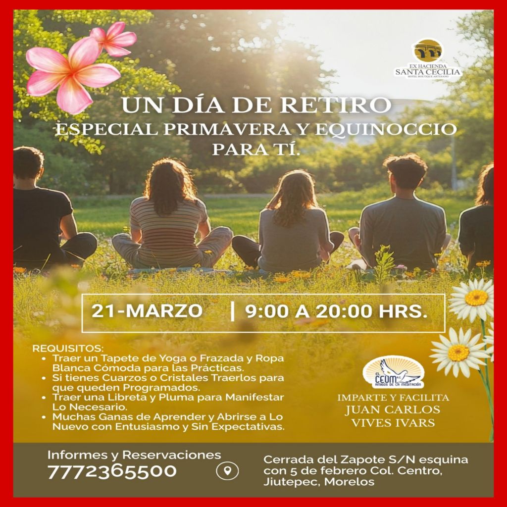 Sábado 21 de Marzo de 9:00 a 20:00 hs. «UN DÍA DE RETIRO ESPECIAL EQUINOCCIO Y PRIMAVERA PARA TÍ.» Imparte y Facilita Juan Carlos Vives Ivars Fundador de EL CENTRO DE ESTUDIOS UNIVERSAL DE MEDITACIÓN A.C. Reservación Obligatoria. Toda la Información en este link: https://jcvives.com/un-dia-de-retiro-especial-primavera-y-equinoccio-para-ti-sabado-21-de-marzo-de-900-a-2000-hs-lugar-extraordinario-y-divino-hotel-boutique-artesano-exhacienda-santa-cecilia-jiutepec-morelos/