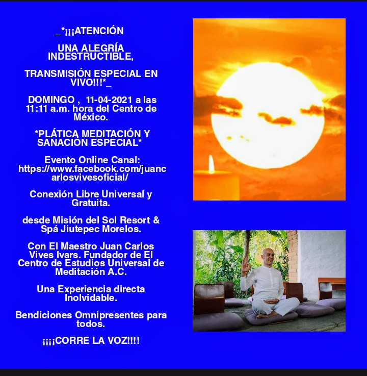 AVISOS: En el Centro de Estudios Universal de Meditación Seguimos Incondicionalmente todo es en Línea todavía, y Las Pláticas, Meditación, Sanación, Conciertos, Yoga Ergonómica son gratuitos para beneficiar y ayudar a la mayor cantidad posible de personas Universalmente.