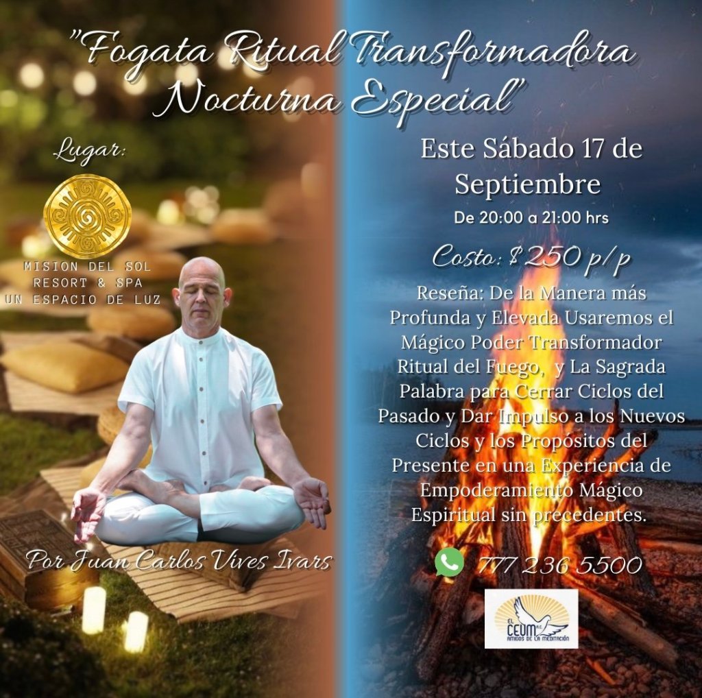 18:15 a 19:15hs. FOGATA RITUAL Especial Cierre de Ciclo. Usaremos el Poder Transmutador del Fuego Universal, las 7 llamas Espirituales, Los 5 Elementos y el Poder del Verbo Creador del Universo para Encauzar, Reorientar y Liberar el Pasado, e Impulsar los Nuevos Propósitos Universales…