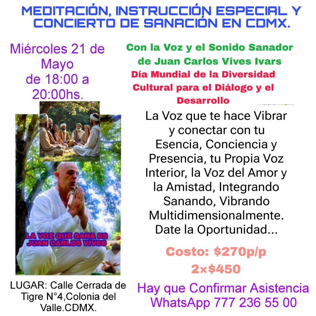Domingo 03 de Agosto «MEDITACIÓN el Arte de Vivir» de 11:11 a 12:30 hs. Donativo Voluntario. Y «CONCIERTO UNIVERSAL DE SANACIÓN ESPECIAL» de 12:30 a 13:30 hs. $250 p/p Con El Maestro Juan Carlos Vives. Informes WhatsApp 777 236 55 00