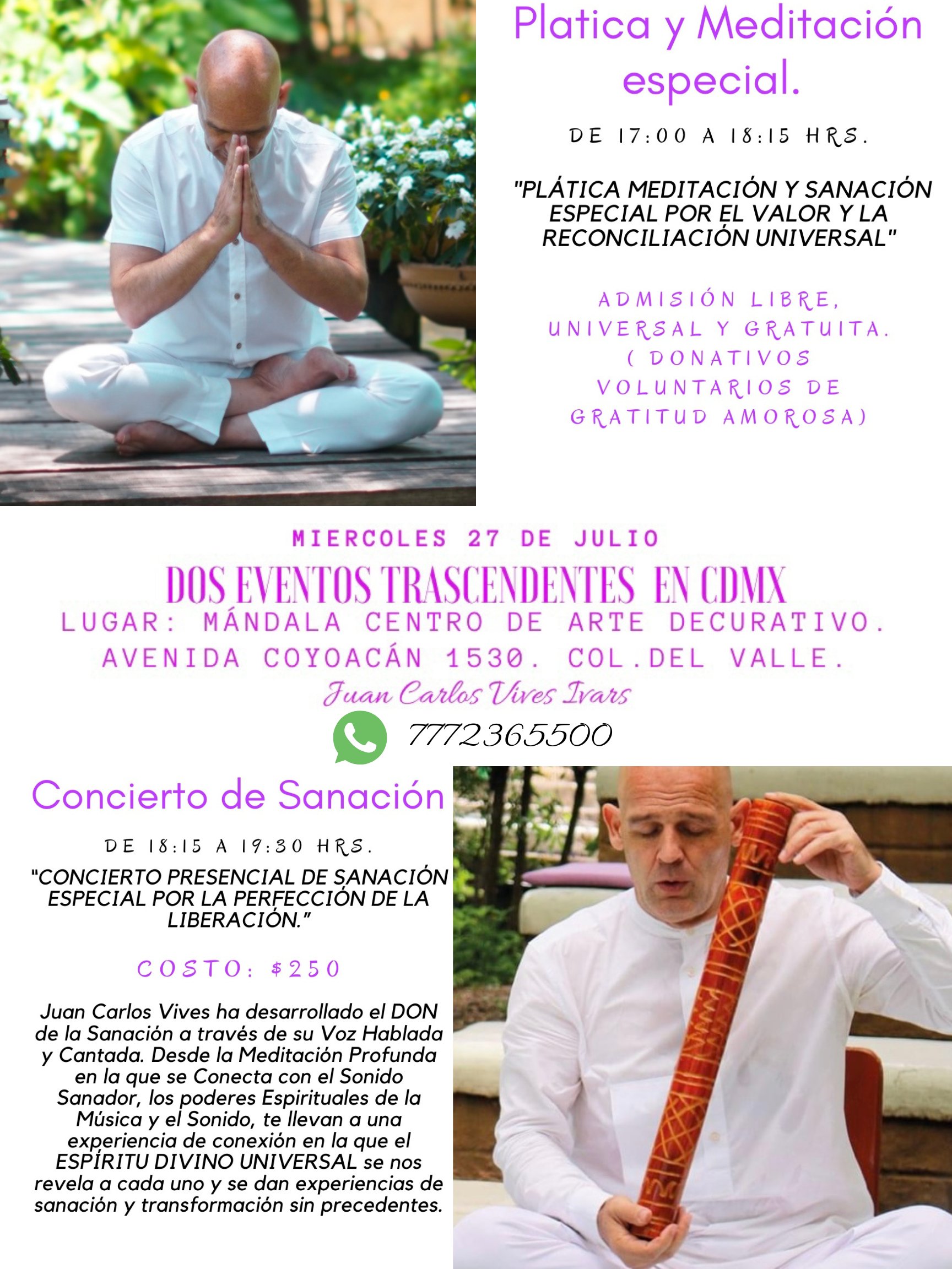 Juan Carlos Vives ha desarrollado el DON de la Sanación a través de su Voz Hablada y Cantada. Desde la Meditación Profunda en la que se Conecta con el Sonido Sanador, los poderes Espirituales de la Música y el Sonido, te llevan a una experiencia de conexión en la que el ESPÍRITU DIVINO UNIVERSAL se nos revela a cada uno y se dan experiencias de sanación y transformación sin precedentes. Informes Whatsapp 7772365500 Difúndelo e Invita Felizmente.