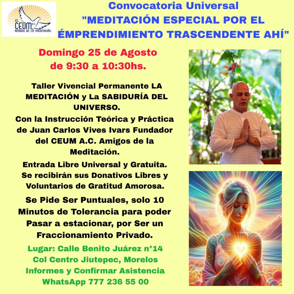 ¡RECUERDA! ESTE DOMINGO MEDITACIÓN E INSTRUCCION ESPECIAL. «EL SENTIMIENTO PURO FLORECE» Desde la Expansion de Conciencia, Salud, Alegría, Prosperidad, Sanación. Seguimos Convocando, Invitando. TALLER VIVENCIAL PERMANENTE DE MEDITACIÓN OPORTUNA Y DESARROLLO HUMANO con Juan Carlos Vives Ivars Fundador del CEUM y Recopilador del Decálogo de la Meditación.Todos los Domingos de 10:10 a 11:30hs. en El Hotel Exhacienda de Santa Cecilia, Calle 5 de Febrero Esq. El Zapote Centro, 62550 Ejido del Centro.( Ubicación Google: https://g.co/kgs/T2GyPT1 ) Informes Whatsapp 7772365500