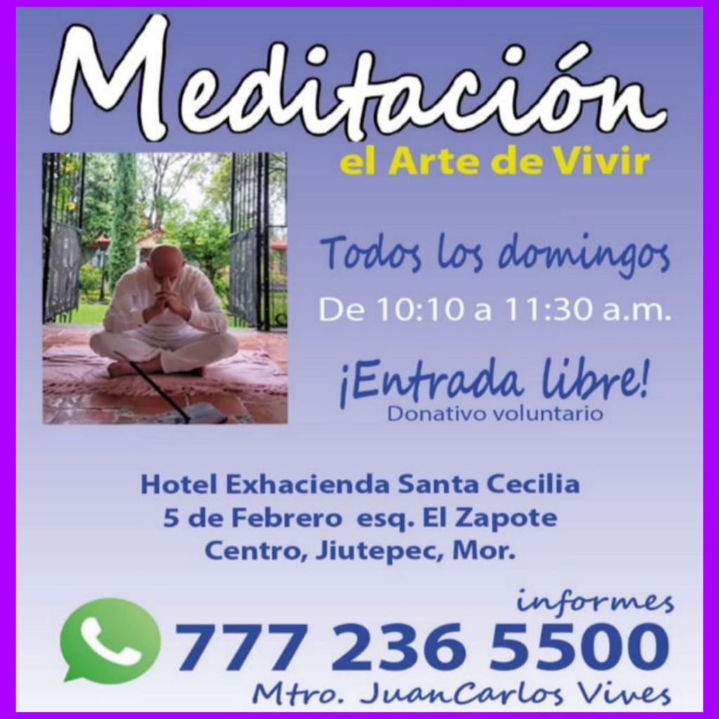 Desde la Expansion de Conciencia, Salud, Alegría, Prosperidad, Sanación. Seguimos Convocando, Invitando. TALLER VIVENCIAL PERMANENTE DE MEDITACIÓN OPORTUNA Y DESARROLLO HUMANO con Juan Carlos Vives Ivars Fundador del CEUM y Recopilador del Decálogo de la Meditación.Todos los Domingos de 10:10 a 11:30hs. en El Hotel Exhacienda de Santa Cecilia, Calle 5 de Febrero Esq. El Zapote Centro, 62550 Ejido del Centro.( Ubicación Google: https://g.co/kgs/T2GyPT1 ) Informes Whatsapp 7772365500