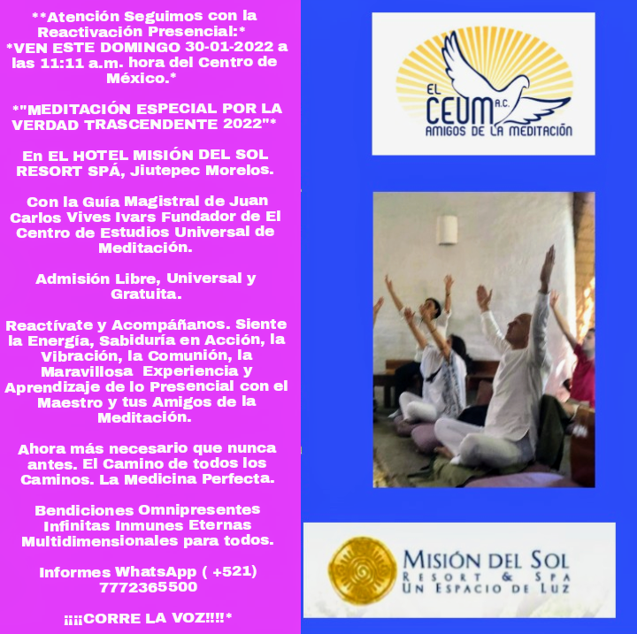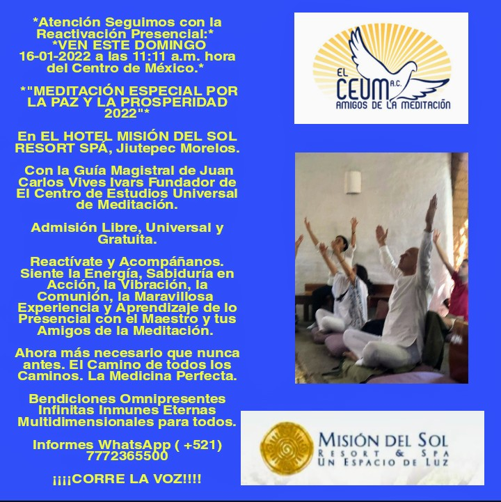 Con la Guía Magistral de Juan Carlos Vives Ivars Fundador de El Centro de Estudios Universal de Meditación. ( EL CEUM) Admisión Libre, Universal y Gratuita. Donativo de Gratitud Amorosa Libres y Voluntarios.