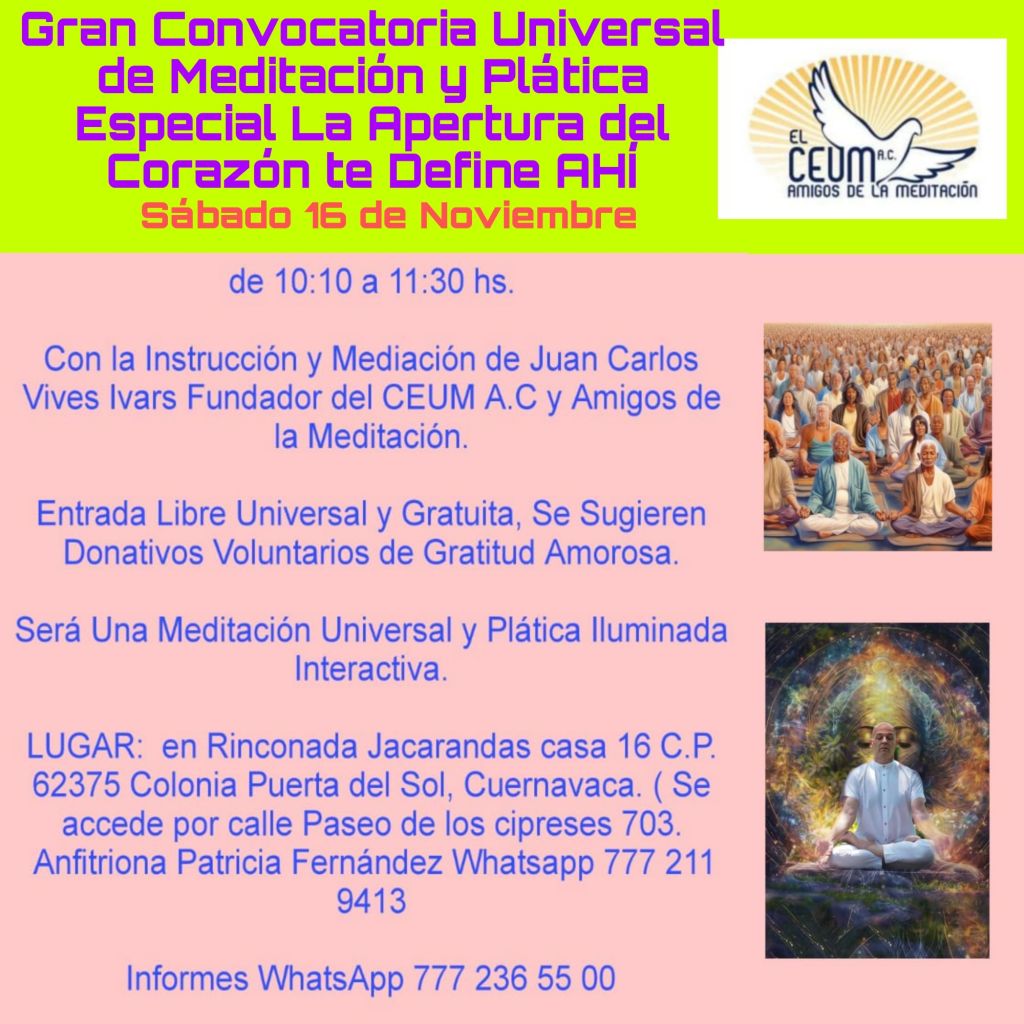CONVOCATORIA UNIVERSAL DE MEDITACIÓN Y PLÁTICA ESPECIAL. LA APERTURA DEL CORAZÓN TE DEFINE AHÍ.