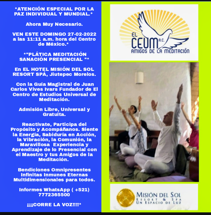 Reactívate, Participa del Propósito y Acompáñanos. Siente la Energía, Sabiduría en Acción, la Vibración, la Comunión, la Maravillosa Experiencia y Aprendizaje de lo Presencial con el Maestro y tus Amigos de la Meditación.