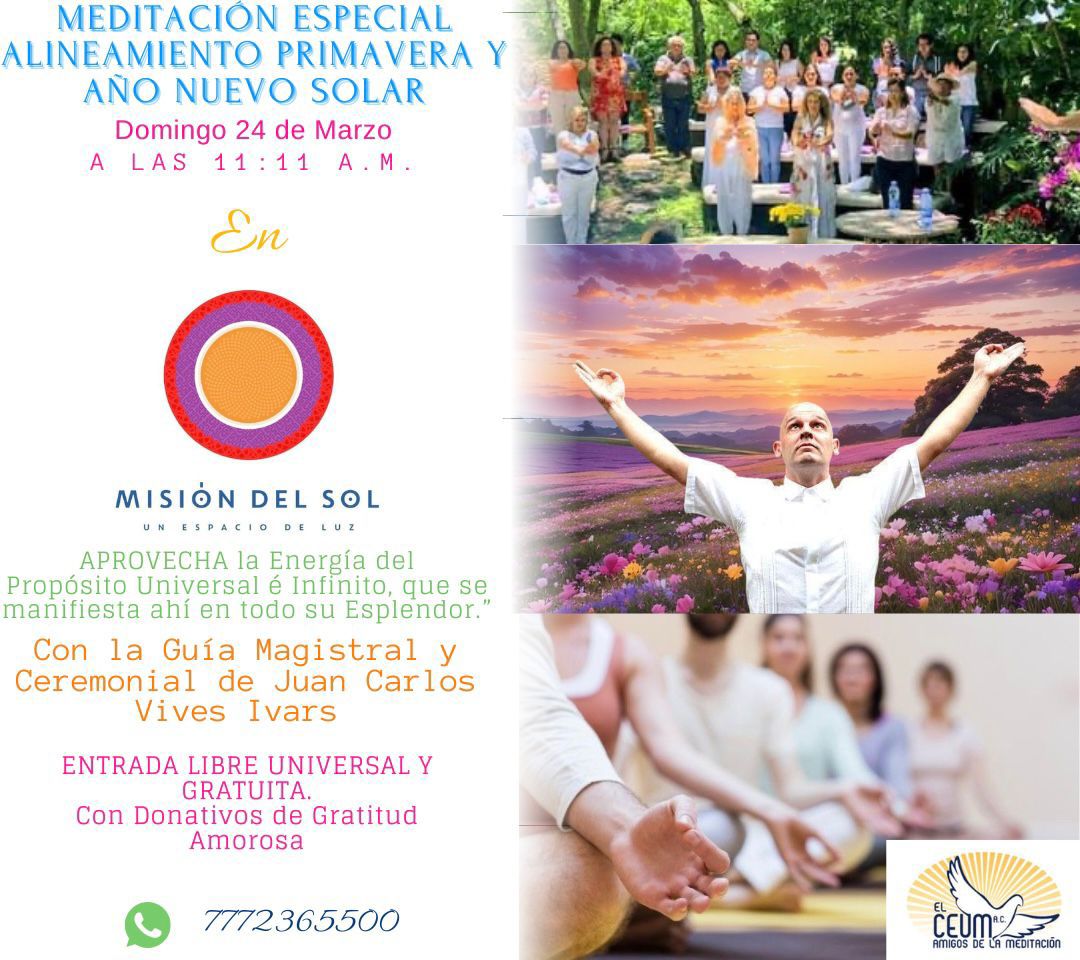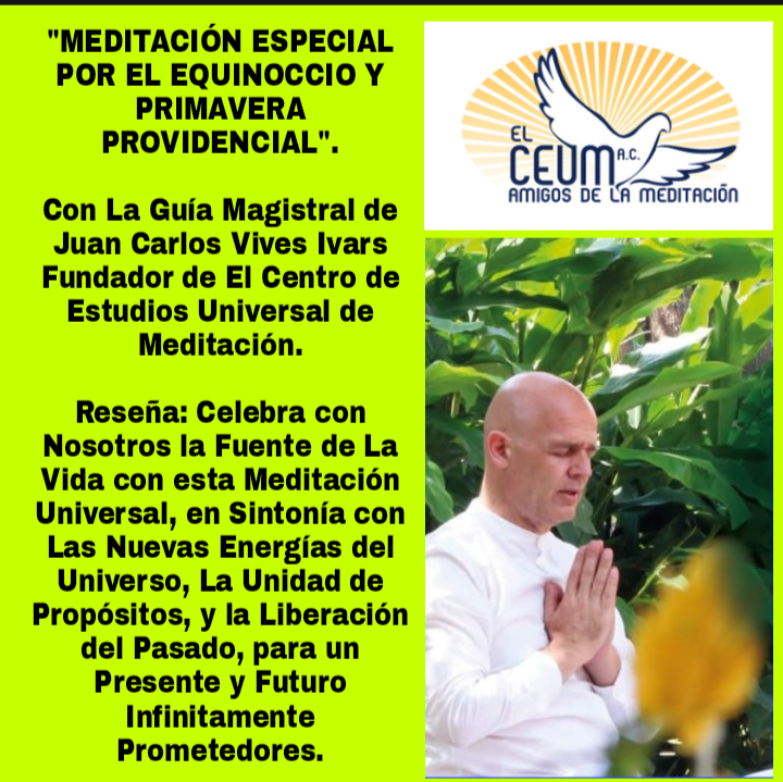 Estemos Atentos a Los Mensajes del Universo. Cada Vez hay más oportunidad de conectarse a lo Profundo y Verdadero. ¿Que pasaría si Realmente fuéramos Constantes y Perseverantes en Nuestra Meditación Individual y Grupal? Hay que reconocer que los Propósitos hay que proponérselos bien para que se cumplan. La totalidad del Universo Apoya a Quien sabe lo que quiere. Esta Semana podemos Reforzar, Alinear, Empoderar, Alinear Nuestras Energías positivas con el Equinoccio, el Inicio de la Primavera y del Año Solar. Y Seguimos Contando con tu Valiosa Presencia en estos y otros Eventos del CEUM (https://jcvives.com/proximos-eventos-especiales/)