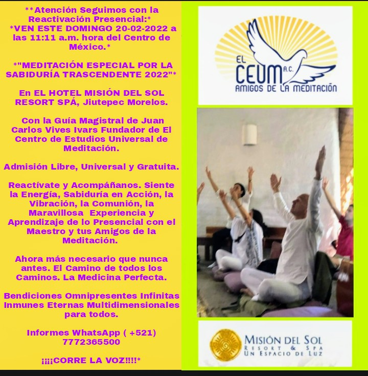 Reactívate y Acompáñanos. Siente la Energía, Sabiduría en Acción, la Vibración, la Comunión, la Maravillosa Experiencia y Aprendizaje de lo Presencial con el Maestro y tus Amigos de la Meditación. Ahora más necesario que nunca antes. El Camino de todos los Caminos. La Medicina Perfecta.